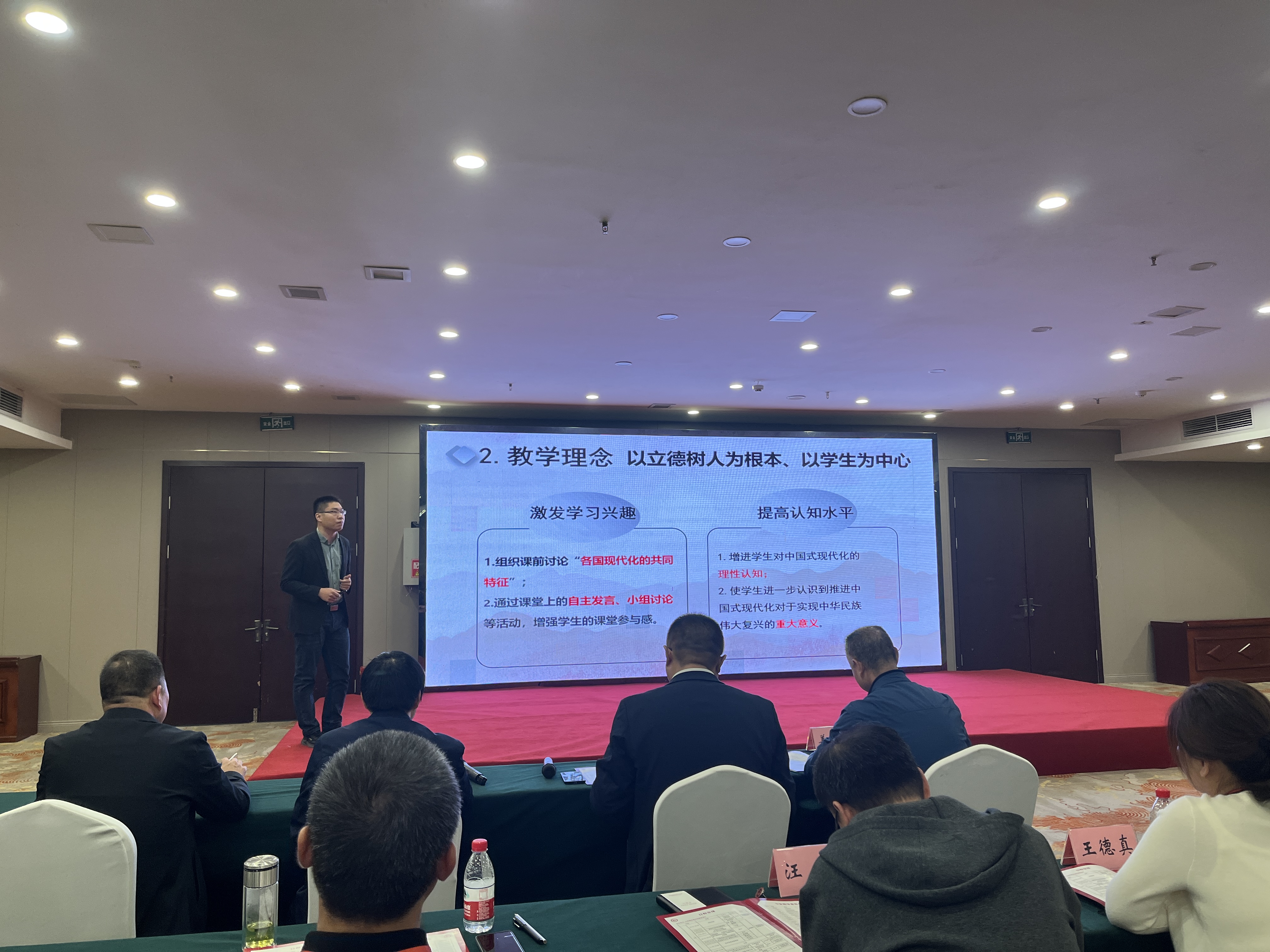 会议上半程,陈洋老师在高校思政课集体备课展示活动环节做了《中国式现代化的中国特色》一课的现场教学展示,专家组成员南阳理工学院马克思主义学院院长姜金林教授针对教学整体过程展开了点评,对陈洋老师扎实的教学功底表示赞叹,进而充分肯定了我院对青年教师的重点培养。