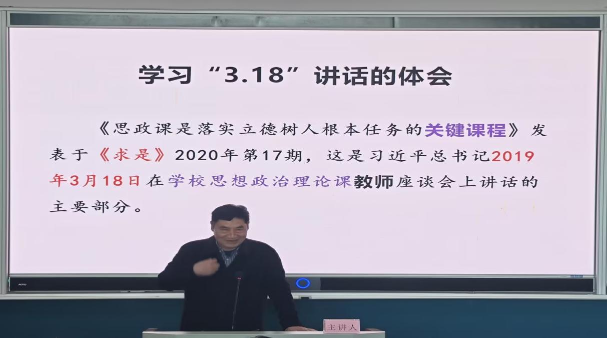 会议第一项,由习近平新时代中国特色社会主义思想教研室主任宋容德教授作主题发言。宋容德教授围绕总书记讲话精神展开解读,并从三个方面谈了学习体会:思政课教师要练好内功,致力于成为“大先生;要读懂教材和学生,实现教材与学生的融合;要增强自信,打造教学品牌。