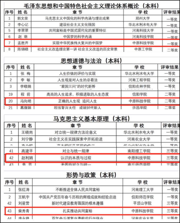 近日,由中共河南省委教育工委、河南省教育厅主办的“关于全省高校思想政治理论课示范‘金课’评选活动”结果出炉。根据中共河南省委教育工委办公室、河南省教育厅办公室《关于开展全省高校思想政治理论课示范“金课”评选活动的通知》(教思政函〔2022〕255号)要求,经各高校申报、资格审查、专家评审、综合评议等环节,10门思政课程共评审出一等奖78个、二等奖129个和三等奖245个。马克思主义学院派出的四位教师全部获奖,其中,孟胜芹获得一等奖,冯向明获得二等奖,赵利娟和柴秀青获得三等奖。