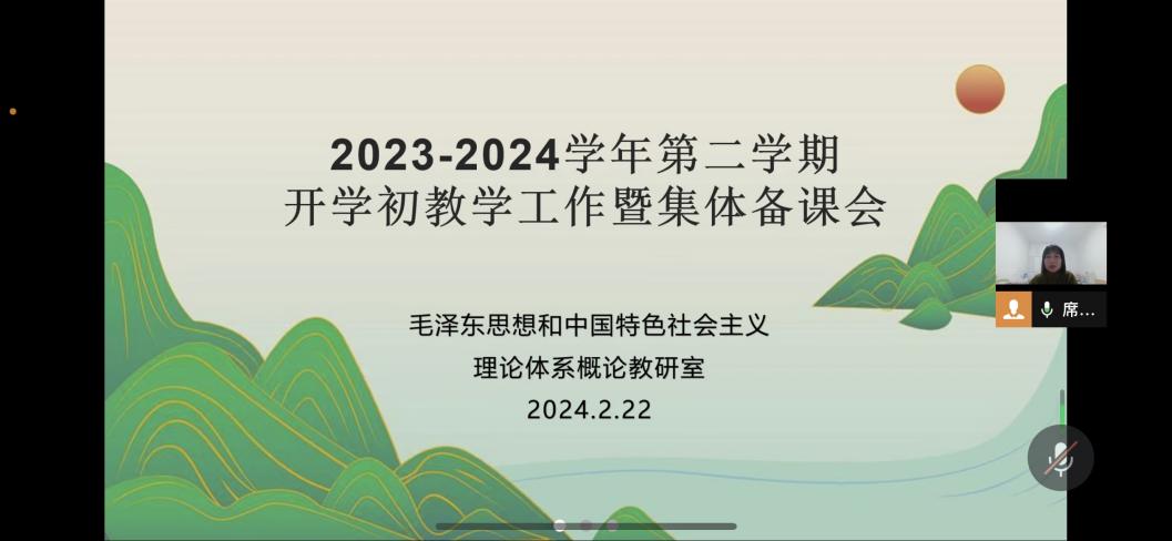 为顺利开展新学期的教学,2月22日《毛泽东思想和中国特色社会主义理论体系概论》教研室召开2024春季学期教学工作暨集体备课会,教研室全体教师以及外聘教师参加会议,教研室负责人席亚楠老师主持本次会议。